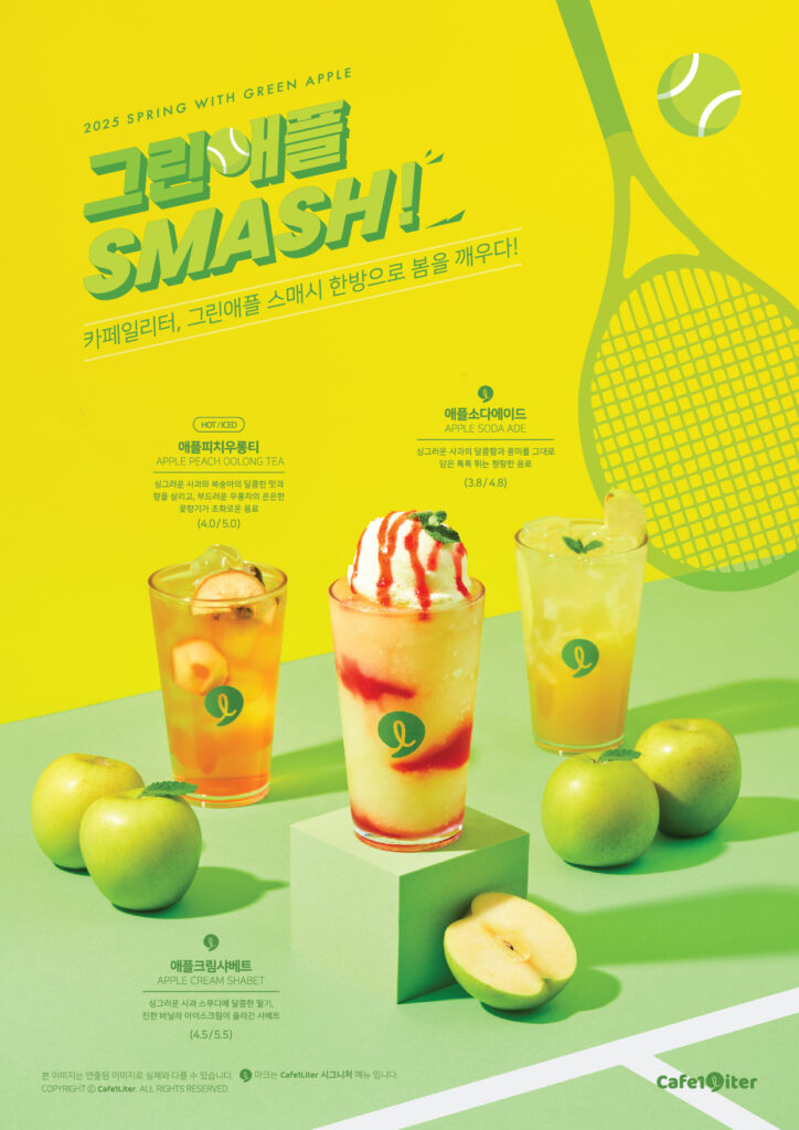 카페일리터는 계절을 대표하는 신선한 과일을 활용한 다양한 메뉴를 지속적으로 선보이며 소비자들에게 색다른 경험을 제공해왔다. 이번 시즌에는 청사과 특유의 상큼함과 신선함을 강조한 ‘그린 애플 스매시 (Green Apple Smash)’ 테마를 바탕으로, 한입 베어 무는 순간 터지는 청사과의 생동감 넘치는 맛을 극대화했다.