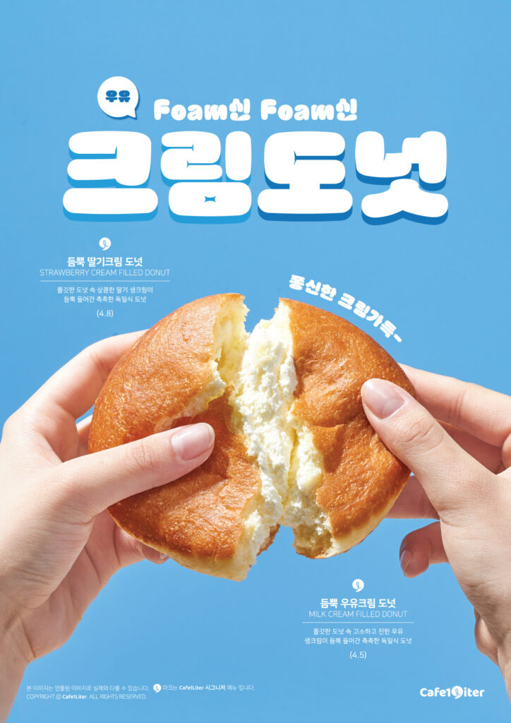 이번에 선보이는 메뉴는 ▲듬뿍 우유크림 도넛 ▲듬뿍 딸기크림 도넛으로, 크고 폭신한 식감이 특징인 독일식 베를리너 (Berliner) 스타일 도넛에 신선한 생크림을 더한 디저트이다.